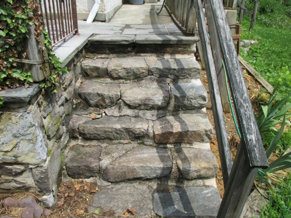 As you can see from this photo, what were once steps leading from the driveway to the pathway have become unrecognizable. The Get It Stoned crew was able to create solid, safe steps leading to a beautiful flagstone walkway and to their lovely home.